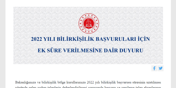 Duyuru için link : https://bilirkisilik.adalet.gov.tr/Home/SayfaDetay/2022-yili-bilirkisilik-basvurulari-icin-ek-sure-verilmesine-dair-duyuru04032022030025
